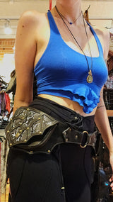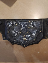 This black, double pocket belt bag has two main compartments and two secret, zippered pockets in the back.