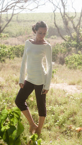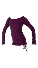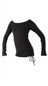 Long sleeves; cinched at the sides. This top hugs the body for a super flattering fit. Made extra long to keep your core warm but can be easily cinched up for a shorter look. 97% cotton with just a touch of Spandex for comfort and stretch. Versatile!