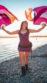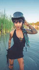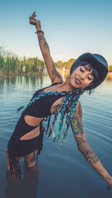 An Envision Festival favorite. With front braid detail that adds a sexy peek-a-boo this dress is a must have for that beach ready look. Wear it as a sexy swim suit cover, pair with leggings for a toned down look, or as is with cute heels for a night out at the club. Adjustable tied modal fabric on back and bottom sides of this mini dress push it to the next level of fun and uniqueness. Perfect for Burning Man while dancing the night away or layering with a longer skirt to adventure into the festival grounds.