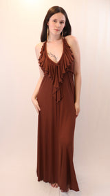 Features: Ruffled V-neckline, halter tie, empire waist, flowy maxi skirt