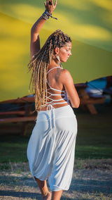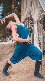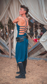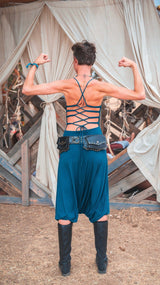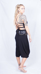 Our unique, corset back Harem Onesie, has a low bottom to just above the knee and allows for flowing, free movement. You will look amazing for day or night time wear. Perfect for a festival or any casual activity, add our Umba Bell Sleeve Shrug for warmth on a chilly fall night.