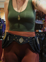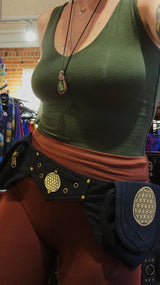 This pocket belt features two main compartments, both having one zippered pocket on the inside as well as a secret zippered pocket on the back. It also features gold hardware, a flower of life pattern on each pocket, and an adjustable waist to ensure the perfect fit!
