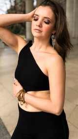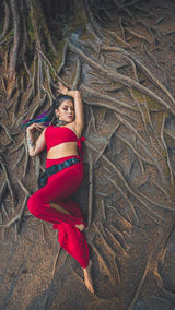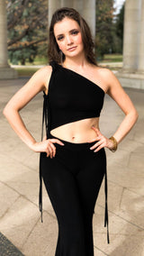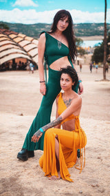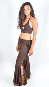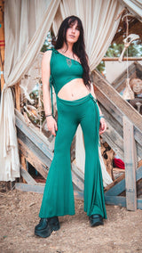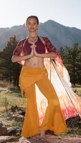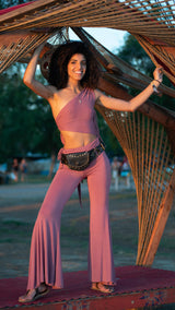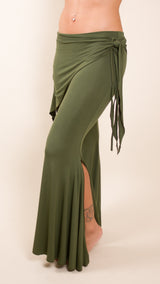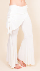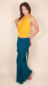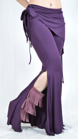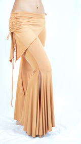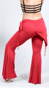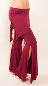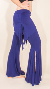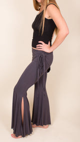 Perfect for a night out, dancing, festivals, yoga or performance arts, these pants embody the "Gypsy" spirit of freedom and movement. Detailed with a side slit up to the knee, these bell bottoms are fluid and flowy. Flip the asymmetrical skirt up, tie over the shoulder and around the back to turn these pants into a Onesie! Made from a soft modal fabric, these pants are super comfortable, and stylish.