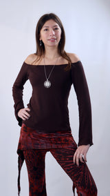The Kalahari Long Sleeve is a sleek, feminine essential with an effortlessly romantic feel. Designed with a flattering off-the-shoulder neckline and softly flared sleeves, this top drapes beautifully while contouring the body. Lightweight and stretchy, it’s the perfect piece for layering or wearing on its own for an elegant, minimalist statement.