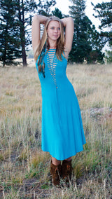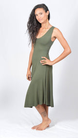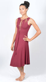 A stunning long silhouetted dress, this Umba classic has a hemline that lands about 2-4 inches below the knee. Reversible, it can be worn with the braid in back for a more sleek conservative look, or braid in front for a more sexy, sultry feel. Lightweight, stretchy fabric drapes in a flattering way for most bodies, and it's wrinkle-free quality makes it the perfect option for travel.