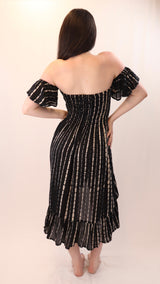Turn heads in this effortlessly romantic off-shoulder dress, designed with a soft smocked bodice and gently ruffled sleeves. The sweetheart tie dye dress has a comfortable, flattering fit that highlights the waist before flowing into a breezy, tiered skirt with a subtle high-low effect. Its tie dye vertical pattern elongates the silhouette, while the lightweight fabric moves beautifully with every step.